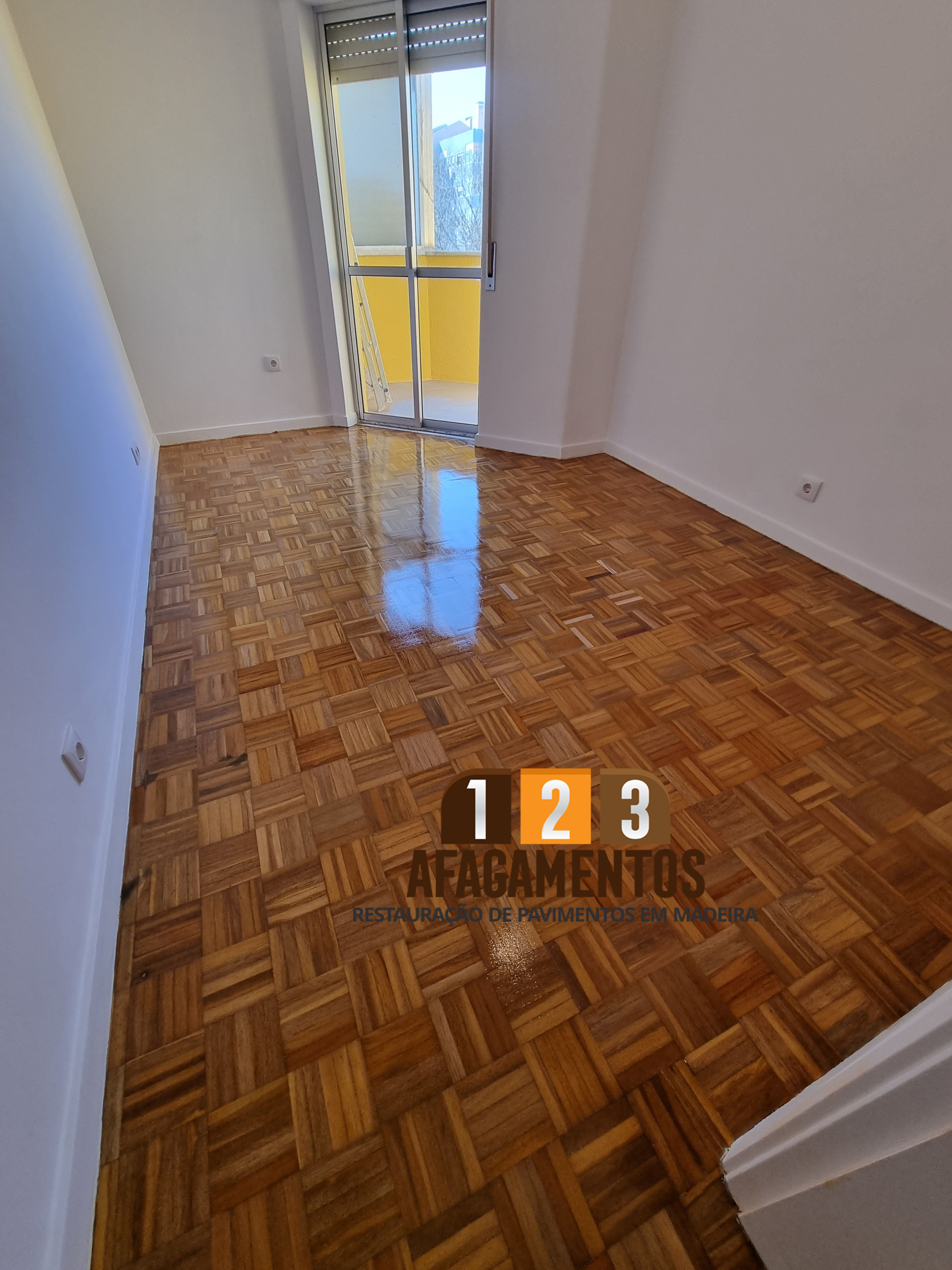 Nesta obra colamos os tacos soltos, foi feito o afagamento, a betumagem das juntas e o envernizamento com 3 de mãos de verniz meio-brilho.