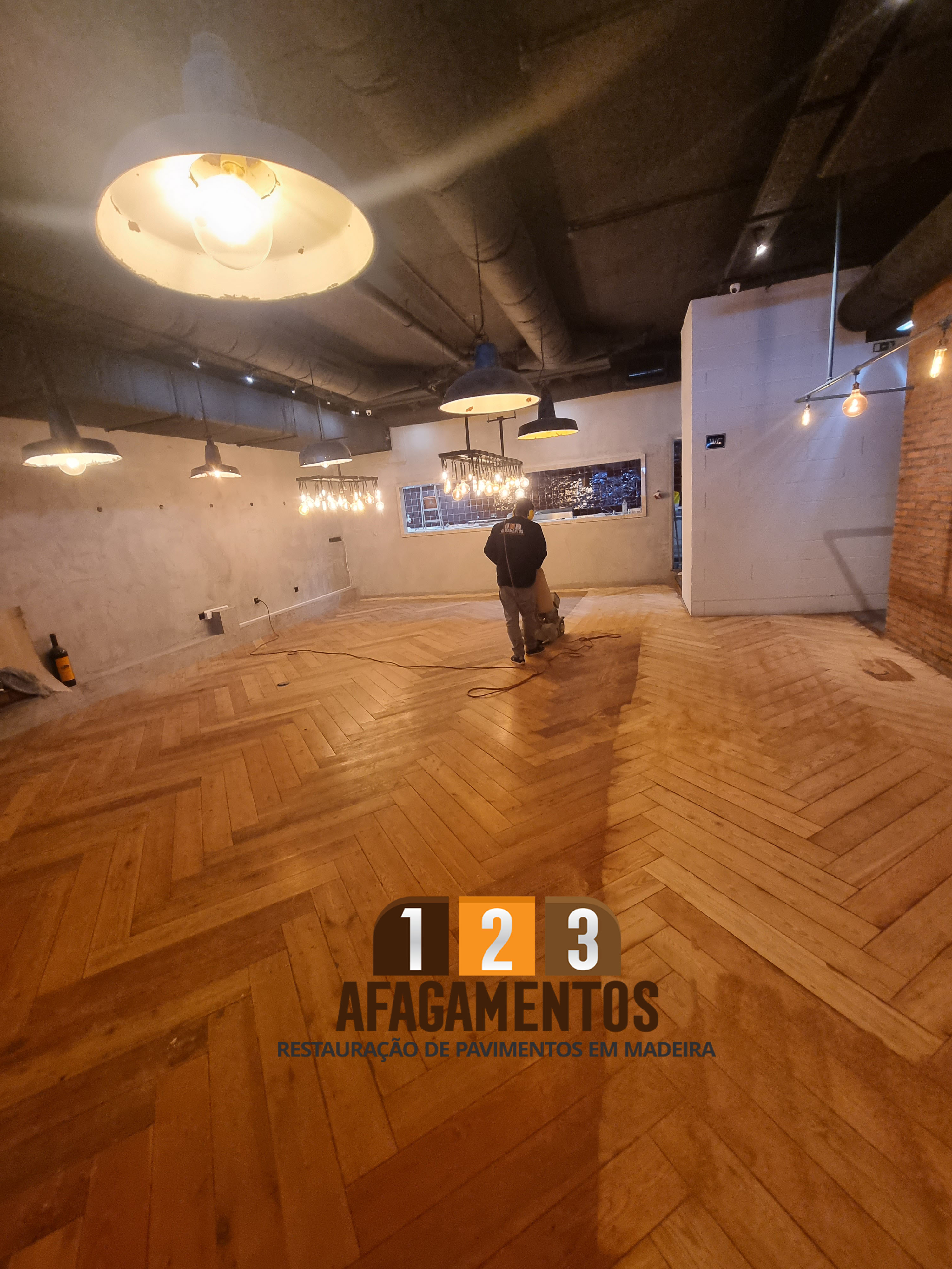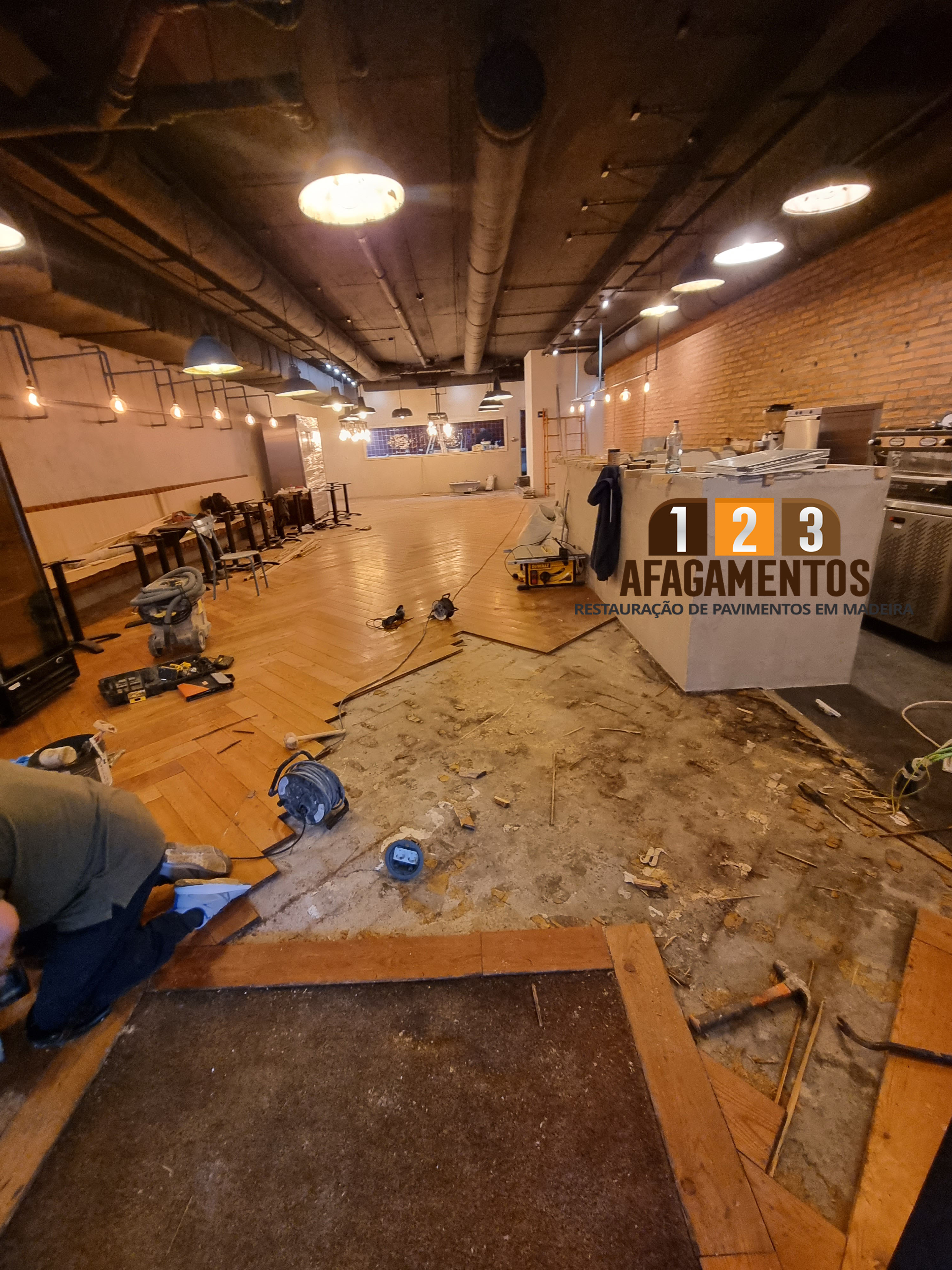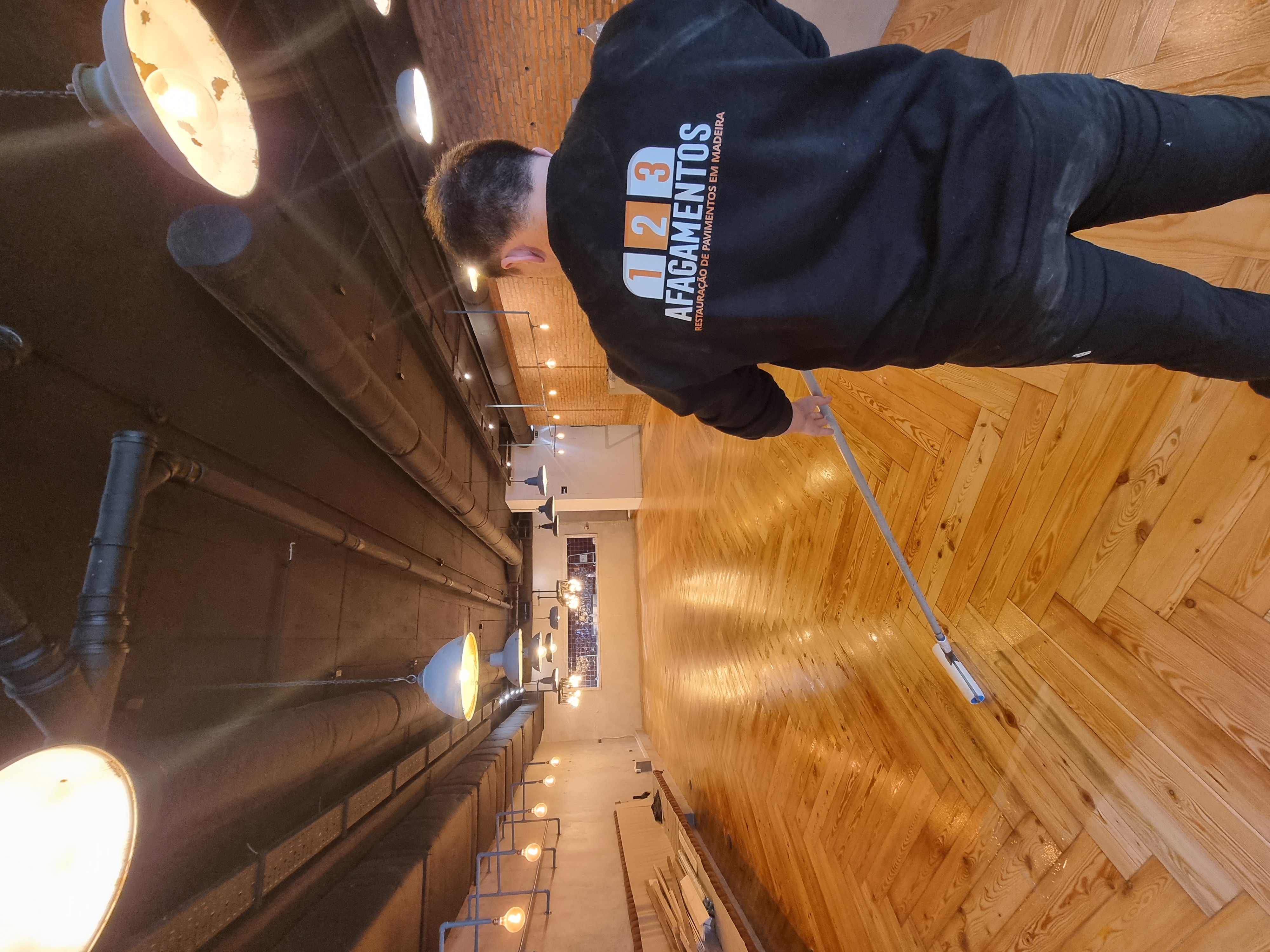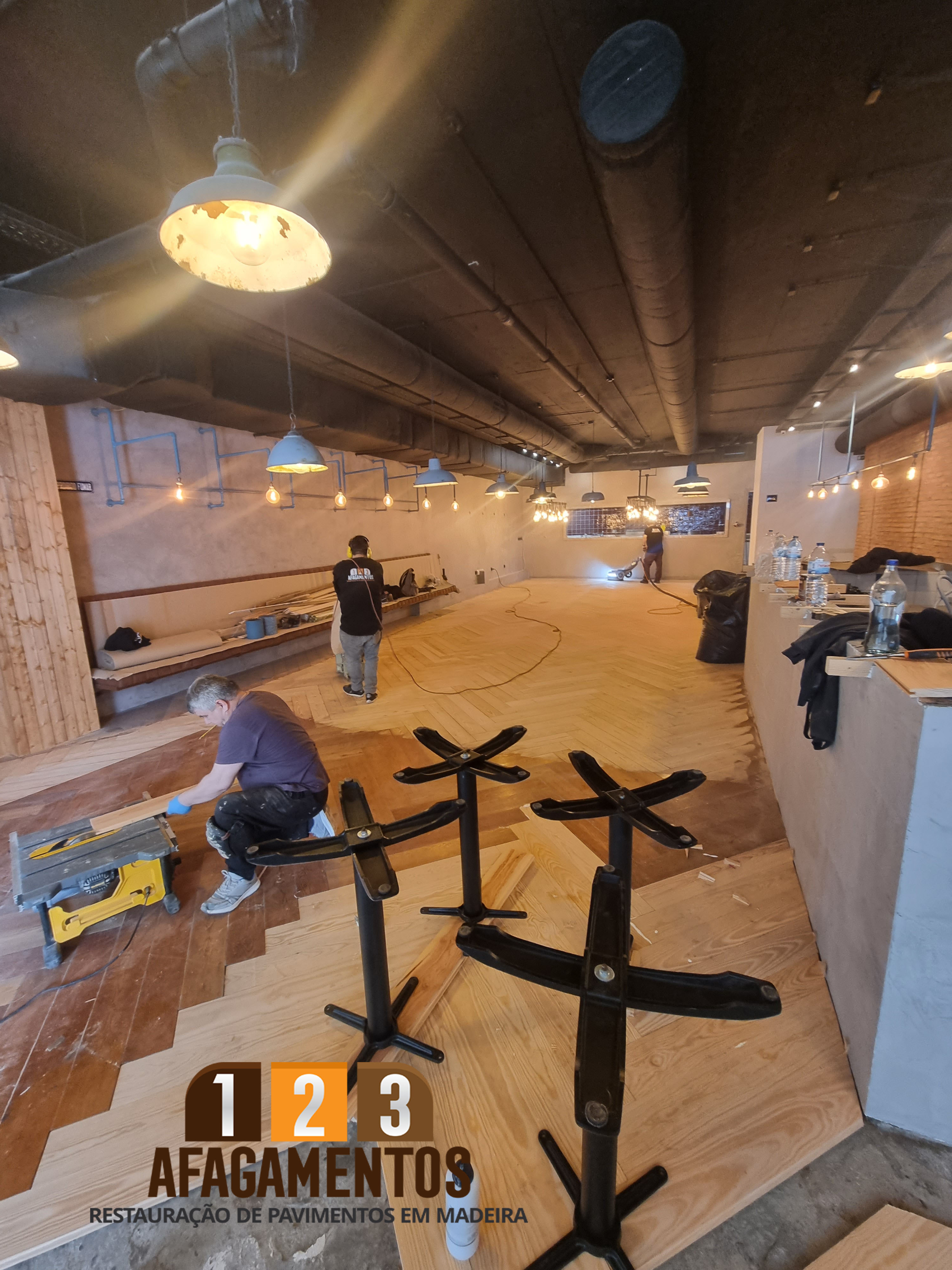 Desta vez fizemos uma intervenção num restaurante onde recentemente teve uma inundação, nesta obra substituiu-se uma parte do pavimento, fizemos o afagamento, betumamos as juntas e envernizamos o soalho com 3 camadas de verniz.